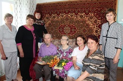 С этой знаменательной датой юбиляров пришли поздравить руководитель Управления пенсионного фонда РФ в Далматовском районе Курганской области Людмила Поташкина, заведующая срочным отделением ГБУ «КЦСОН по Далматовскому району» Ирина Курина, председатель РайПО Галина Полухина и начальник отдела кадров ОАО «Завод «Старт» Елена Брежнева. В дружественной обстановке гости вручили именинникам персональные поздравления от Президента России, приветственные адреса от Администрации Далматовского района, цветы и памятные подарки. Людмила Григорьевна, поздравляя юбиляров, отметила, что в марте 2015 года пара отметит еще один юб