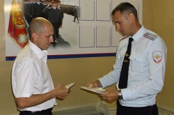 Мероприятие началось с торжественного момента – чествования сотрудников полиции, вышедших на пенсию – Олега Федоровича Шабурова, помощника оперативного дежурного, прапорщика полиции, и Дмитрия Анатольевича Морозова, дознавателя отдела дознания, капитана полиции. П.А. Таушканов, председатель Совета ветеранов внутренних войск, вручил им памятные знаки «За вернос