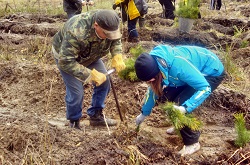 Вооружившись железным мечом и маленькими зелеными саженцами, участники с энтузиазмом, большим интересом и старанием высадили около 2000 молодых сосен.