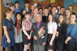 В преддверии празднования 70-летия Победы Притобольная районная библиотека совместно с президиумом Притобольного Совета ветеранов провели классный час с учащимися 11-х классов Глядянской школы (учитель истории Якунина Т.Ф.). Методист районной библиотеки Алякина Е.Г. рассказала об основных битвах Великой Отечественной войны и наших земляках, участниках судьбоносных сражений. На встречу был приглашен участник Великой Отечественной войны Комогоров Александр Васильевич. Нелегок жизненный путь Александра Васильевича. В раннем детстве остался без родителей, ходил, собирал милостыню по деревням, голодный, босой, пока не подобрали добрые люди и не оформили в детский дом. Александр Васильевич вспоминает: «У меня хорошие воспоминания о детском доме, так как я только там стал сытым, жил в тепле, спал на кровати». Александра Васильевича призвали на фронт 17-летним юноше