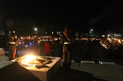 Колонны выходят на исходные позиции. Первая колонна идет с западной стороны поселка, именно там, в годы войны был расположен эвакогоспиталь. Вторая колонна идет с восточной стороны поселка, там был расположен Лебяжьевский райвоенкомат. Третья колонна, самая многочисленная идет со стороны площади поселка. Зажигаются факелы и свечи. Над колонной с фа