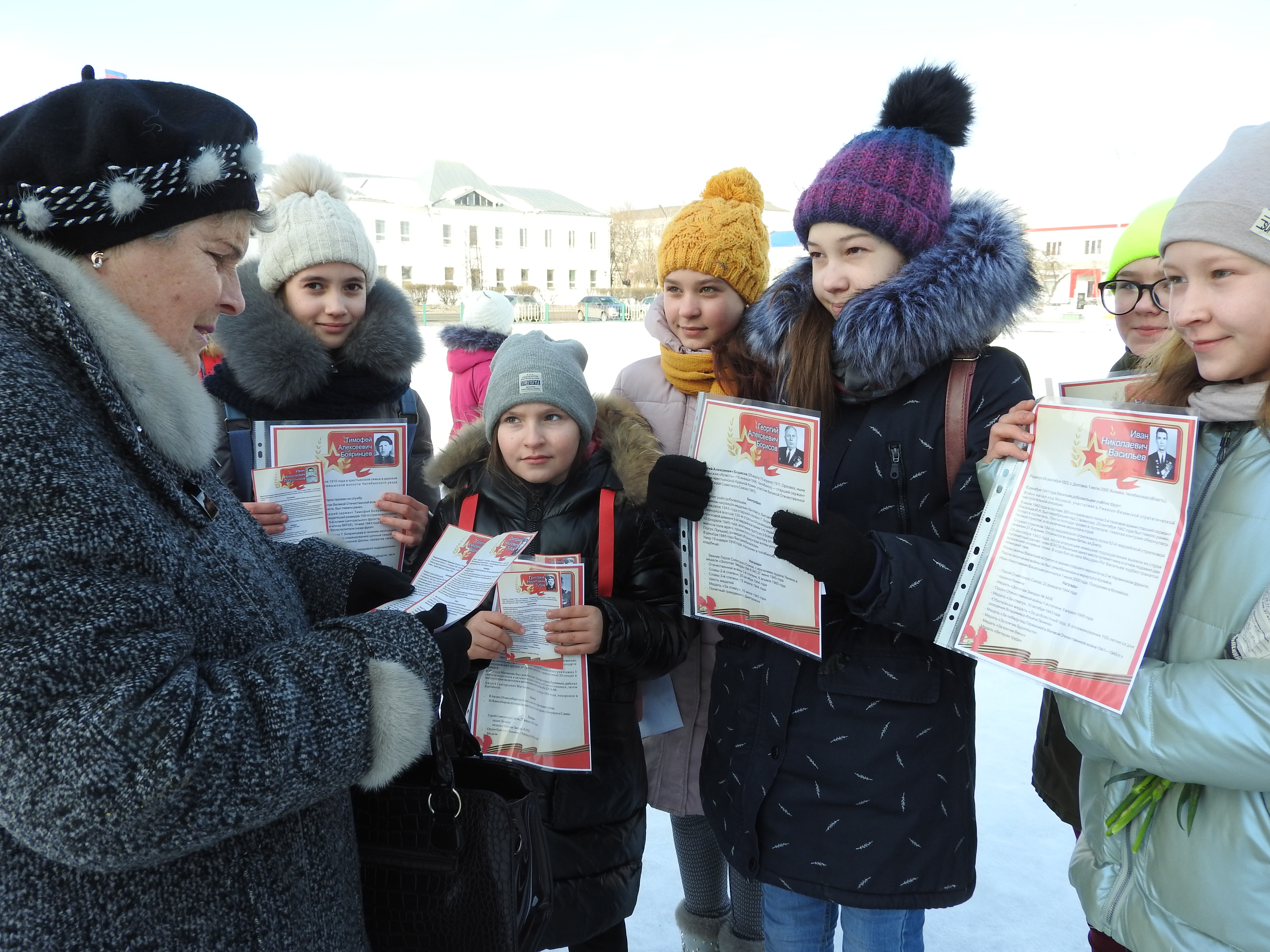 На центральной площади учащиеся ДШИ раздали жителям памятные буклеты, в которых рассказывается о подвигах Героев Советского Союза – уроженцев Куртамышского района: Борисов Георгий Алексеевич, Бояринцев Тимофей Алексеевич, Васильев Иван Николаевич, Зубов Григорий Никитович, Лоскутников Иван Николаевич и Матвиенко Андрей Григорьевич. Ребята возложили цветы к памятнику воинам Великой Отечественной войны. Ровно 75 дней осталось до празднования 75-ти летия Великой Победы. Около 10 тыс. жителей Куртамышского района ушли на фронт защищать свою Родину, из них 6,5 тысяч навсегда остались ле