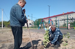 В поселке Лебяжье приступили к высадке саженцев деревьев: клена, ивы, рябины, чубушника, дерена белого.