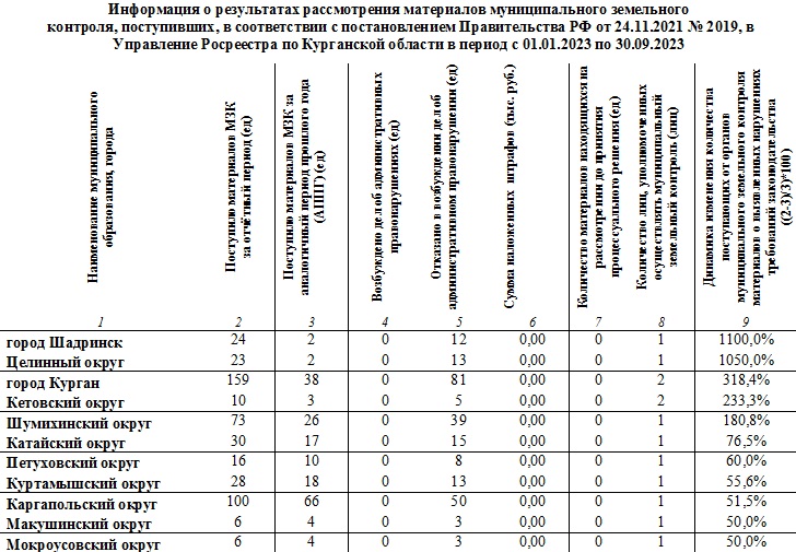 Управление Федеральной службы государственной регистрации, кадастра и картографии по Курганской области рассмотрело материалы органов муниципального земельного контроля о выявленных нарушениях требований законодательства, поступившие из муниципальных образований региона, за период с 1 января по 31 сентября текущего года.
