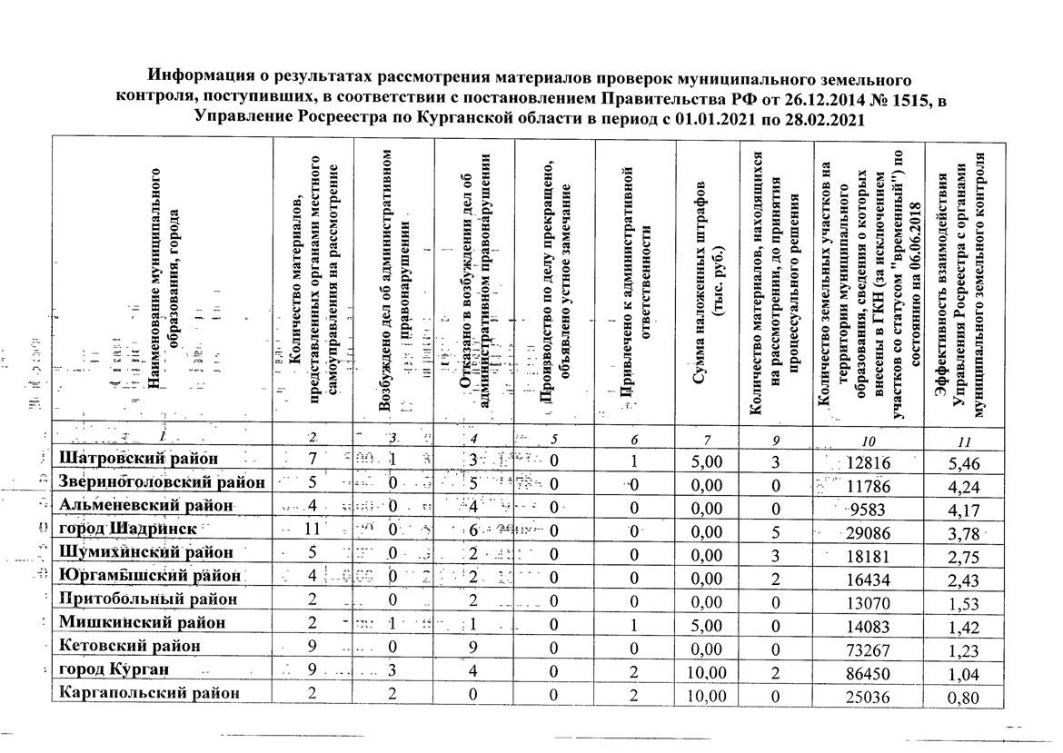 Муниципальный земельный контроль – одна из важных составляющих пополнения бюджета муниципалитетов. Однако на практике данный вид контроля используется пока недостаточно активно. В связи с этим Управление Федеральной службы государственной регистрации, кадастра и картографии по Курганской области доводит до сведения глав муниципальных образований информацию о проведенных проверках муниципального земельного контроля и принятых по итогам рассмотрения материалов мерах за период с 1 января 2021 г. по 28 февраля 2021 г.