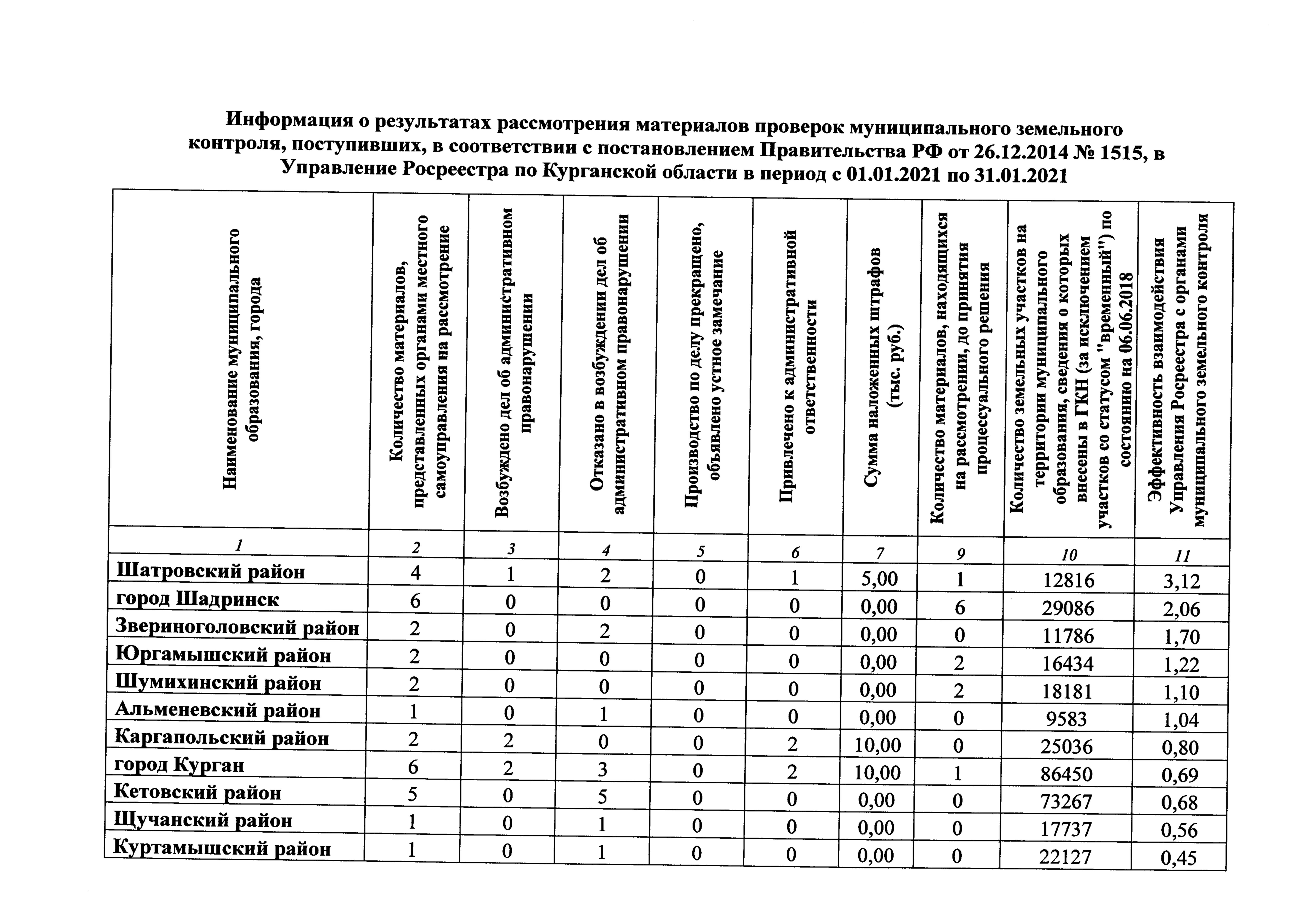 Муниципальный земельный контроль – одна из важных составляющих пополнения бюджета муниципалитетов. Однако на практике данный вид контроля используется пока недостаточно активно. В связи с этим Управление Федеральной службы государственной регистрации, кадастра и картографии по Курганской области доводит до сведения глав муниципальных образований информацию о проведенных проверках муниципального земельного контроля и принятых по итогам рассмотрения материалов мерах за период с 1 января 2021 г. по 31 января 2021 г.