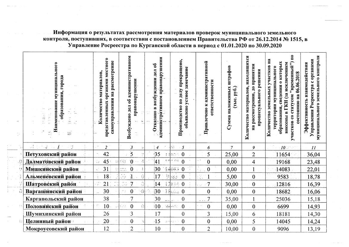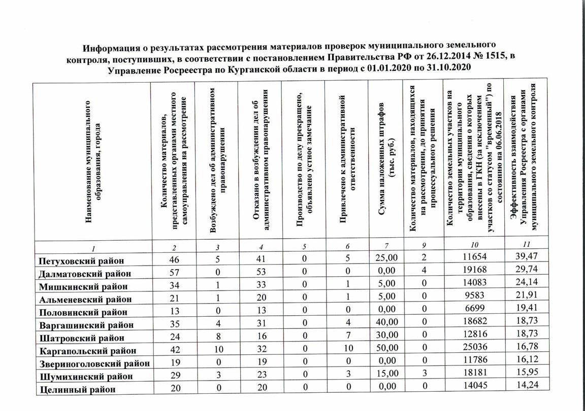 Муниципальный земельный контроль – одна из важных составляющих пополнения бюджета муниципалитетов. Однако на практике данный вид контроля используется пока недостаточно активно. В связи с этим Управление Федеральной службы государственной регистрации, кадастра и картографии по Курганской области доводит до сведения глав муниципальных образований информацию о проведенных проверках муниципального земельного контроля и принятых по итогам рассмотрения материалов мерах за период с 1 января 2020 г. по 31 октября 2020 г.