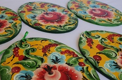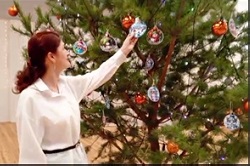 Дерево украшено деревянными красными и синими лошадками, овальными досками, лисицами и звёздами, оригинальными панно и берестяными изделиями.