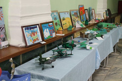 Перед началом концерта многие задерживались в фойе Центра. Здесь была расположена выставка участников районного конкурса «Подарок защитнику Отечества». Более 150 поделок детей со всего района были представлены в экспозиции. Здесь расположились вязаные крючком куклы-морячки, макеты танков и самолетов, выполненные из бумаги и картона, и выполненные в разных техниках картины с танками и крейсерами, и аппликации из разных материалов на военные темы…