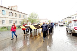 День Победы в Юргамыше начался с акций «Георгиевская лента», «Солдатская каша», «Георгиевская ленточка». По улицам Юргамыша было пронесено большое полотнище в виде Георгиевской ленты. Великая история Георгиевской ленты заслуживает, чтобы ее краски, черный и желтый, обозначали Победу. Пронос Георгиевской ленты – это признательность, дань уважения погибшим в боях. Участие в этой акции приняли сотрудники Администрации района, члены волонтерского корпуса 70-летия Победы, школьники Юргамышской средней школы, жители поселка.
