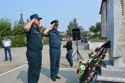 Церемония началась с возложения венка к памятнику погибшим пожарным и минуты молчания.