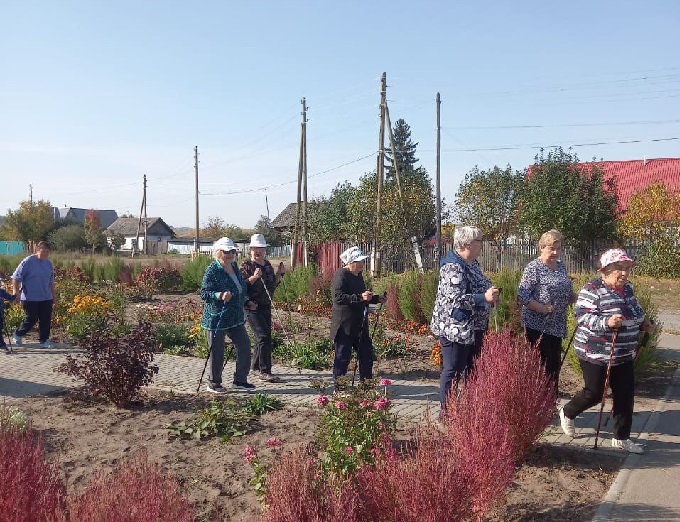 18 человек собралось на начале дистанции – в основном женщины пенсионного возраста, люди с ограниченными возможности, от 36 до 84 лет. Понятно, что путь в 10 000 шагов преодолеть одним махом было трудно, поэтому участники делали остановки для отдыха: постояли-посидели у цветочных клумб, заглянули в сельскую библиотеку, а в сельском Доме культуры посмотрели выставку творческих работ семьи Жёлтышевых.