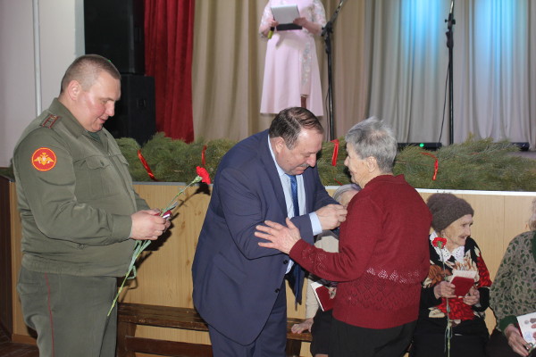 Много слов глубокой признательности звучало в это день в адрес ветеранов. В преддверии 75–летия Великой Победы Президентом Российской Федерации В.В. Путиным учреждена памятная юбилейная медаль. Одними из первых в районе из рук Леонида Рассохина и Вячеслава Марковских юбилейные медали получили труженики тыла Бахарева Мария Абрамовна, Власова Екатерина Александровна, Кандакова Ксенья Михайловна, Охотина Ефросинья Степановна и Почетный гражданин Шатровского района Кубарева Нина Александровна.