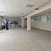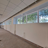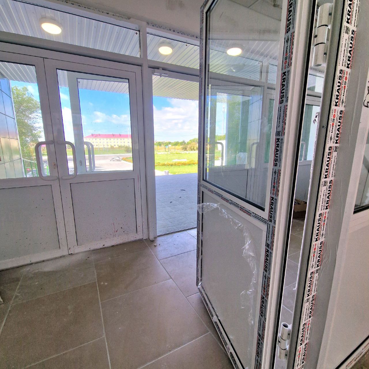 Поменяли всё: на полу - плитка, потолок - подвесной, новые входные двери не только центральные, но и запасных выходов, стена столовой из стеклоблоков заменена на витражные стеклопакеты, новые внутренние двери...