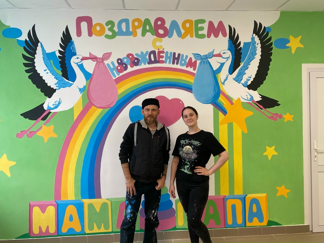 Педагоги дополнительного образования ДЮЦ "Радуга" Александр Синякин и Мария Петрова завершили проект «Творческое добро: Роспись зала выписки в Каргапольском роддоме».