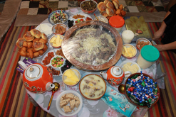 В культурно-оздоровительном центре была развернута широкая выставка- ярмарка. Здесь можно было посетить юрту, рассмотреть национальные костюмы, войлочные изделия, лоскутные корпе, традиционные национальные украшения, насладиться казахским дастарханом, приобрести блюда национальных кухонь. Всего в изобилии.